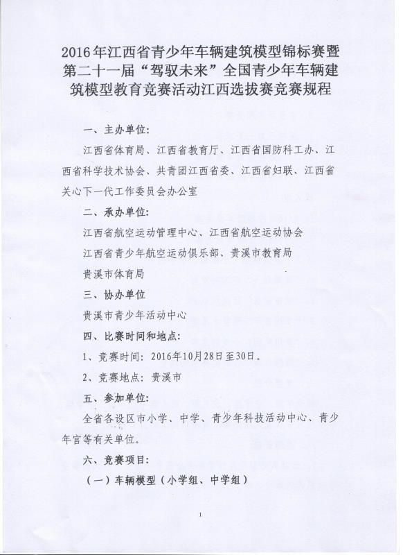 内容详情 2016年江西省青少年车辆建筑模型锦标赛暨第二十一届“驾驭未来”全国青少年车辆建筑模型教育竞赛活动江西选拔赛竞赛规程 时间:2016-06-23 来源: 上一篇:2016年江西省青少年航空航天模型锦标赛暨第十八届“飞向北京-飞向太空”全国青少年航空航天模型教育竞赛活动江西选拔赛竞赛规程 | 下一篇: 省航空运动管理中心召开党委(扩大)“两学一做”学习教育第一专题学习会