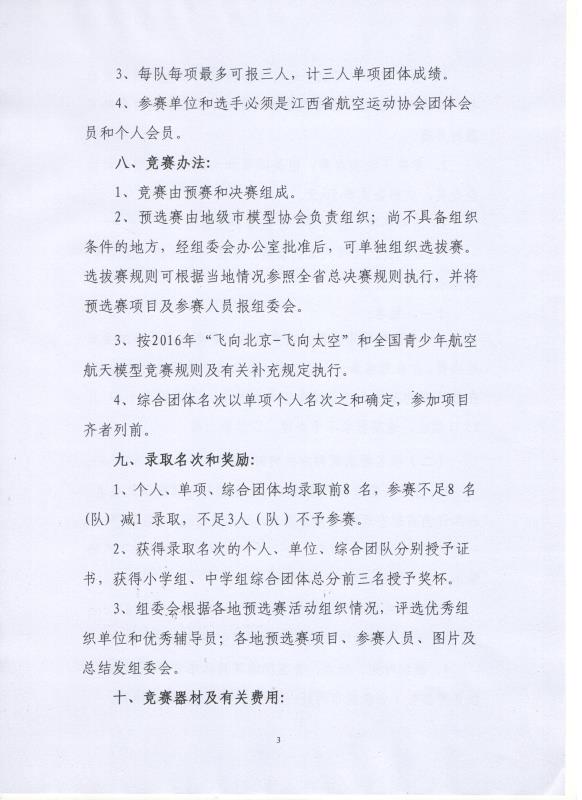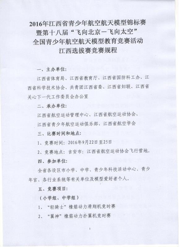 内容详情 2016年江西省青少年航空航天模型锦标赛暨第十八届“飞向北京-飞向太空”全国青少年航空航天模型教育竞赛活动江西选拔赛竞赛规程 时间:2016-06-23 来源: 上一篇:2016年江西省青少年航海模型锦标赛暨第十七届“我爱祖国海疆” 全国青少年航海模型教育竞赛活动江西选拔赛竞赛规程 | 下一篇: 2016年江西省青少年车辆建筑模型锦标赛暨第二十一届“驾驭未来”全国青少年车辆建筑模型教育竞赛活动江西选拔赛竞赛规程