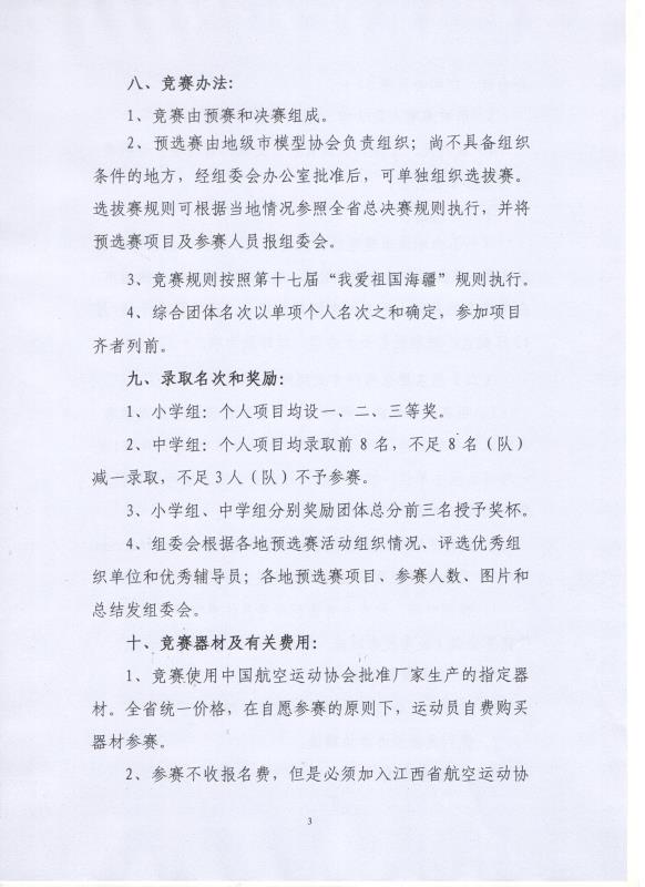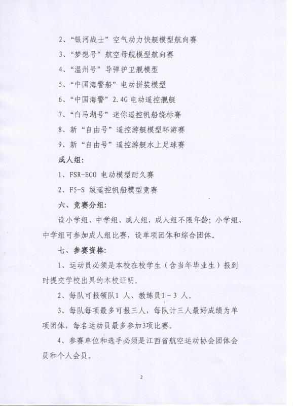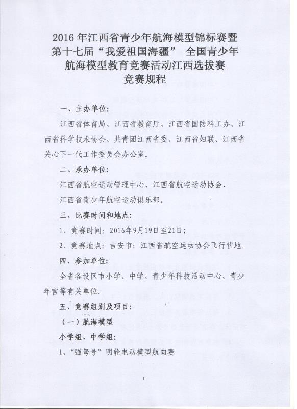 内容详情 2016年江西省青少年航海模型锦标赛暨第十七届“我爱祖国海疆” 全国青少年航海模型教育竞赛活动江西选拔赛竞赛规程 时间:2016-06-23 来源: 上一篇:江西省第五届全民健身运动会航空航天模型竞赛规程 | 下一篇: 2016年江西省青少年航空航天模型锦标赛暨第十八届“飞向北京-飞向太空”全国青少年航空航天模型教育竞赛活动江西选拔赛竞赛规程