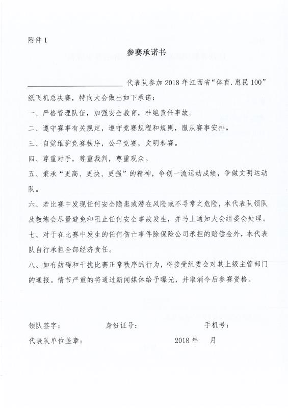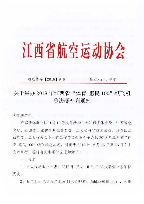 内容详情 关于举办2018年江西省“体育.惠民100”纸飞机总决赛补充通知 时间:2018-11-12 来源: 上一篇:省航空运动管理中心召开会议贯彻传达省体育局“五型”政府建设动员部署会议精神 | 下一篇: 2018全国航空模型公开赛(江西站)圆满落幕