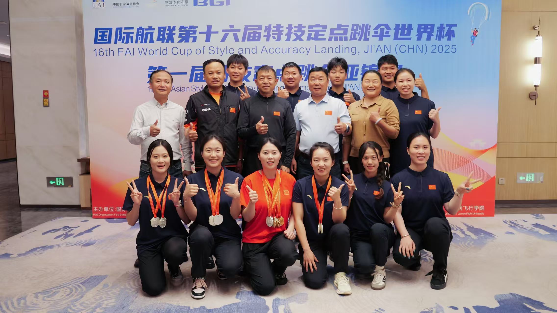 10月30日,为期六天的2025年国际航联第十六届特技定点跳伞世界杯暨第一届特技定点跳伞亚锦赛在江西吉安桐坪通用机场圆满收官。代表国家队出战的江西运动员廖玉婷、崔琦、陈文静、张学艺表现亮眼,共斩获6金7银。其中廖玉婷获得跳伞世界杯女子个人定点冠军、女子集体定点冠军、国家女子团体冠军、女子全能亚军以及跳伞亚锦赛女子个人定点冠军、女子集体定点冠军、国家女子团体冠军、女子全能亚军,并打破了女子个人定点连续踩点亚洲纪录;崔琦获得跳伞世界杯青年女子个人定点亚军、青年女子全能亚军、女子集体定点亚军,陈文静、张学艺获得跳伞世界杯女子集体定点亚军,在家门口的国际赛场为祖国和家乡赢得荣誉。